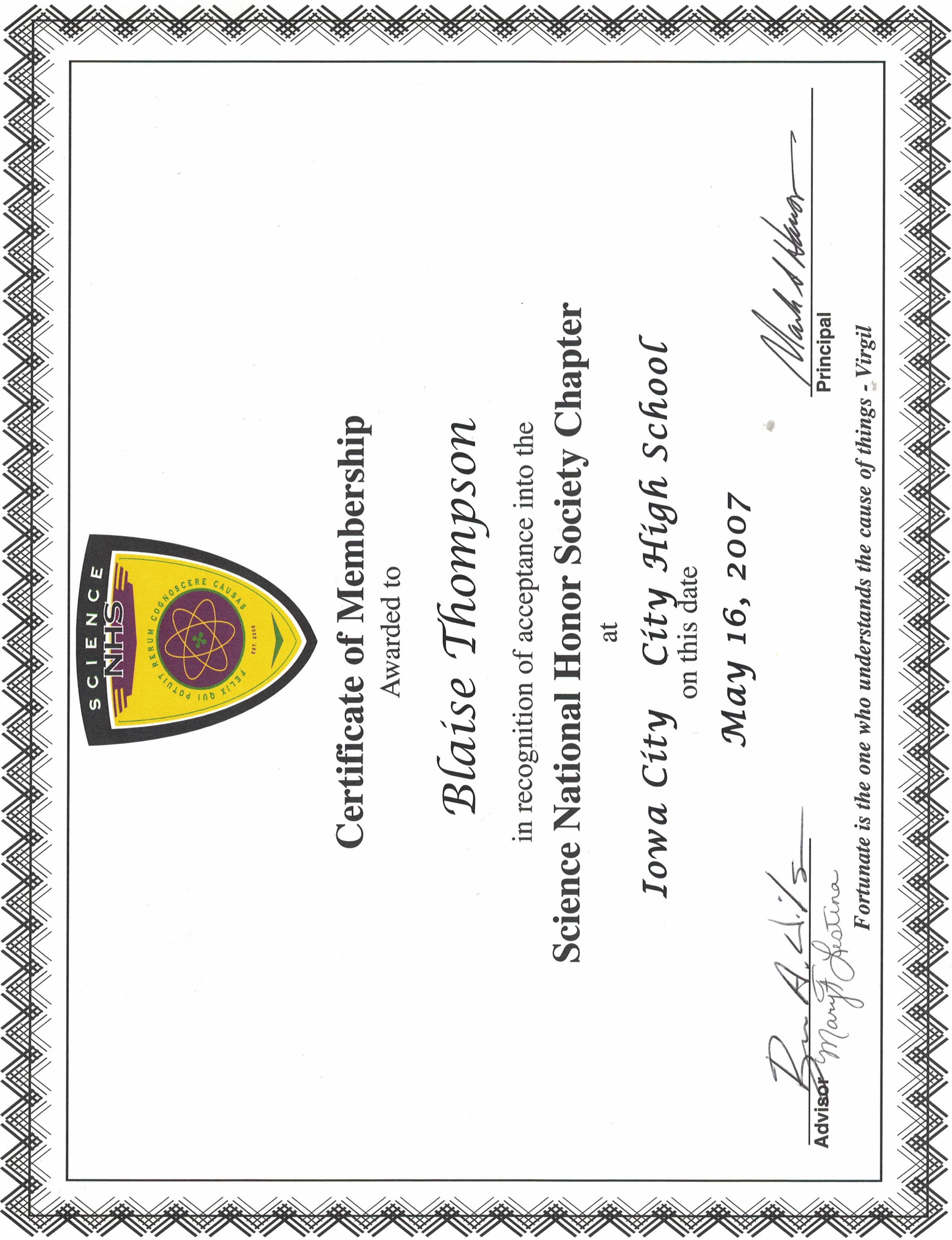 Awarded for high achievement in High School academics.Science National Honor Society 2007